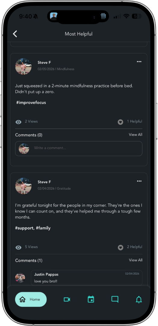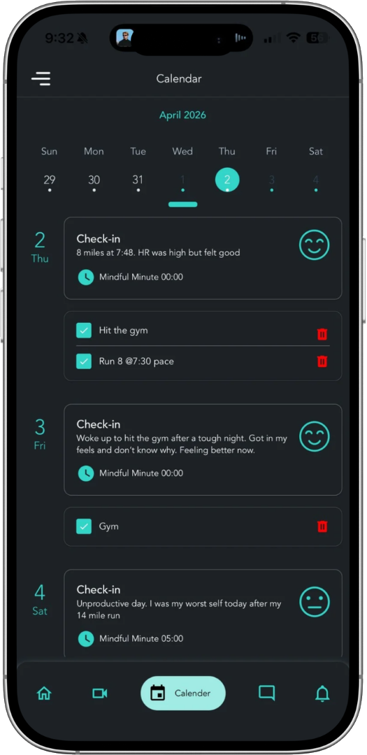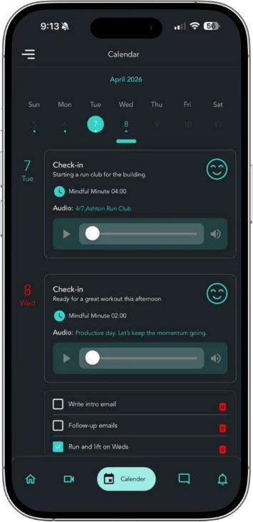 Set Actions that roll forward until completed. Your calendar becomes a full personal timeline — mood check-ins, mindful minutes, voice notes, and completed Actions all in one place. A quick look tells you whether you’re on track or off. Use it, seriously.